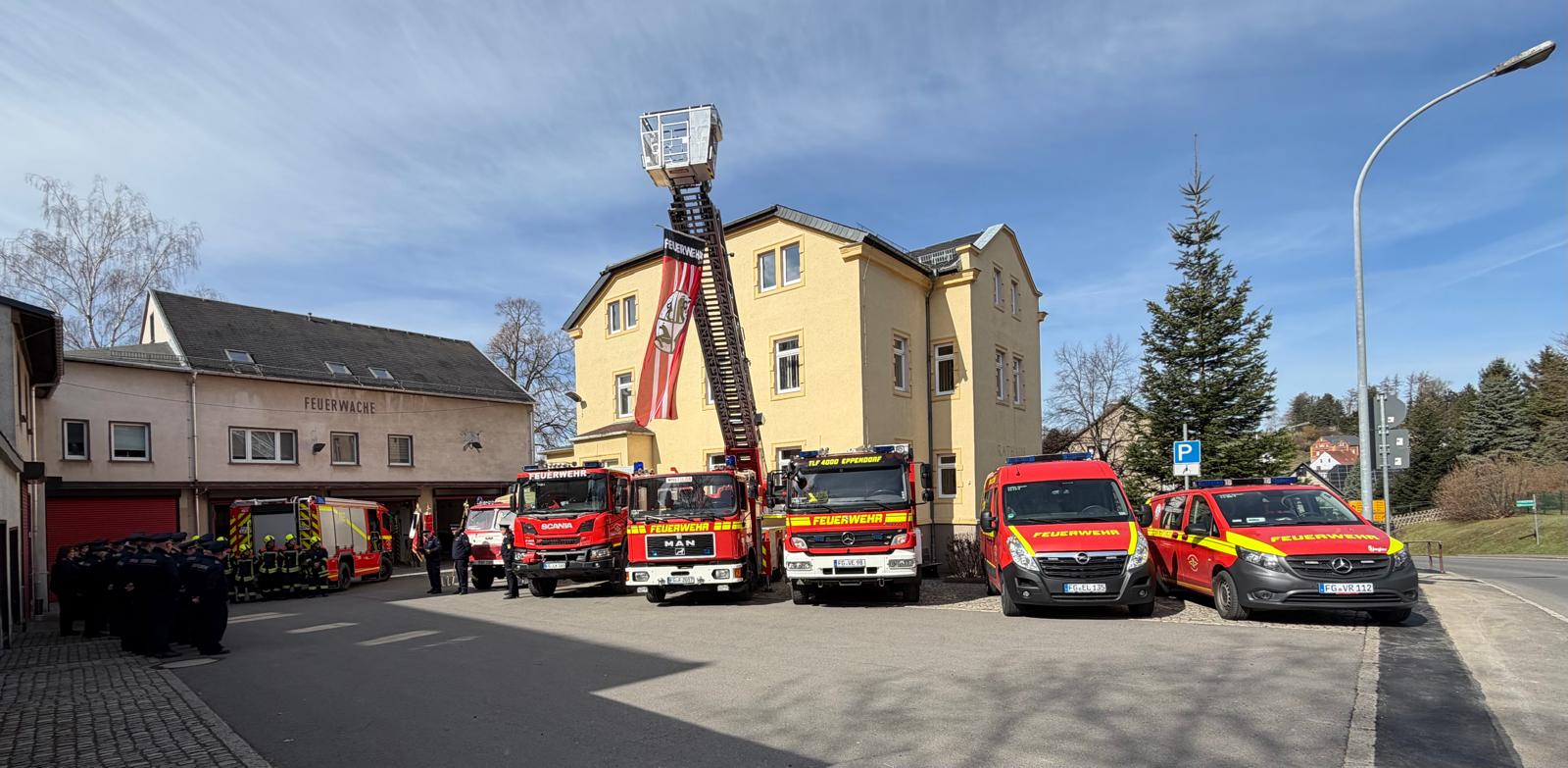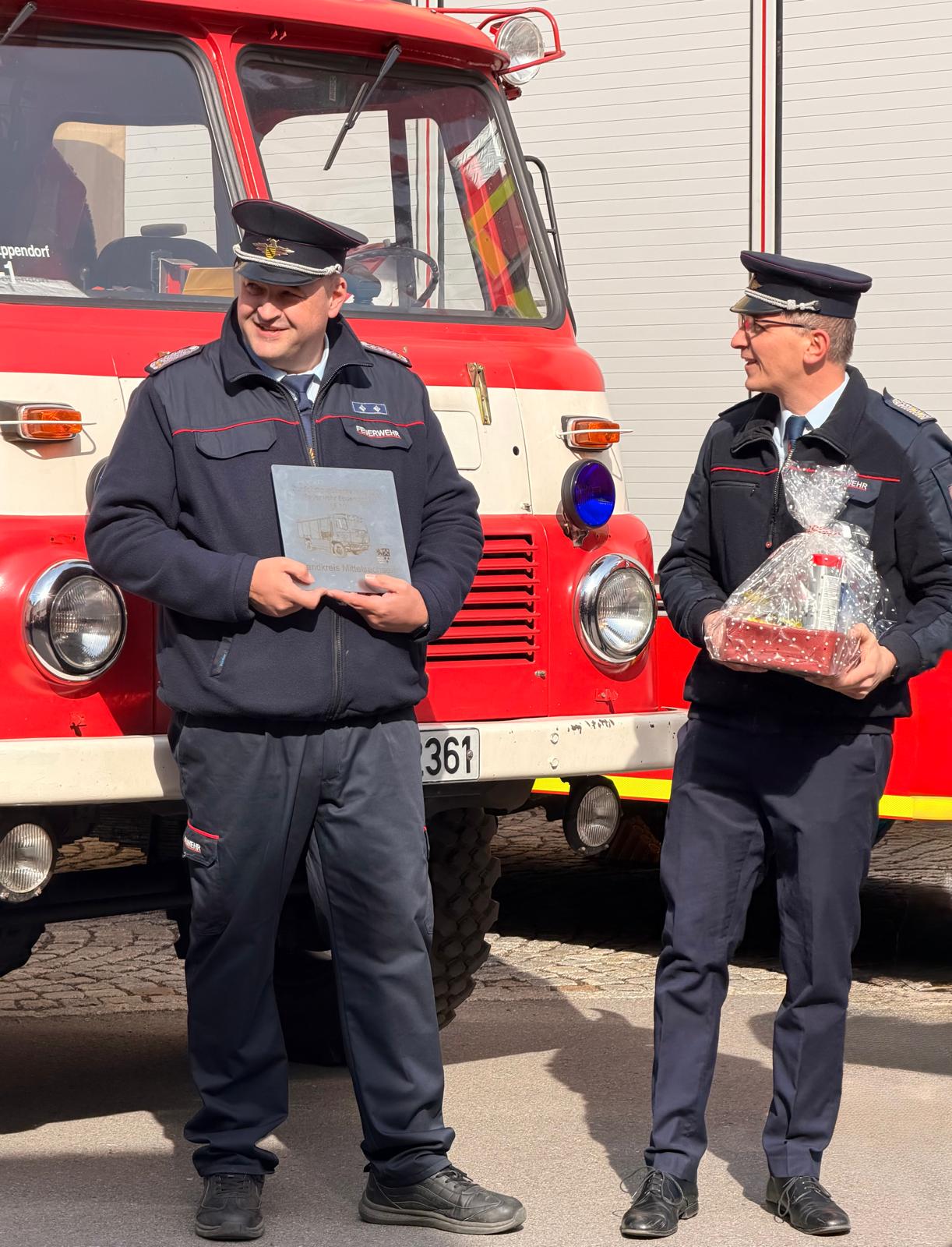Es folgten noch kurze Informationen zum Fahrzeug, welches seit Anfang Februar schon einige Einsätze abgearbeitet hatte. Zum Abschluss überbrachten der Bürgermeister, der stellvertretende Kreisbrandmeister und die beiden Ortswehrleiter von Kleinhartmannsdorf und Großwaltersdorf Grußworte und kleine Präsente.